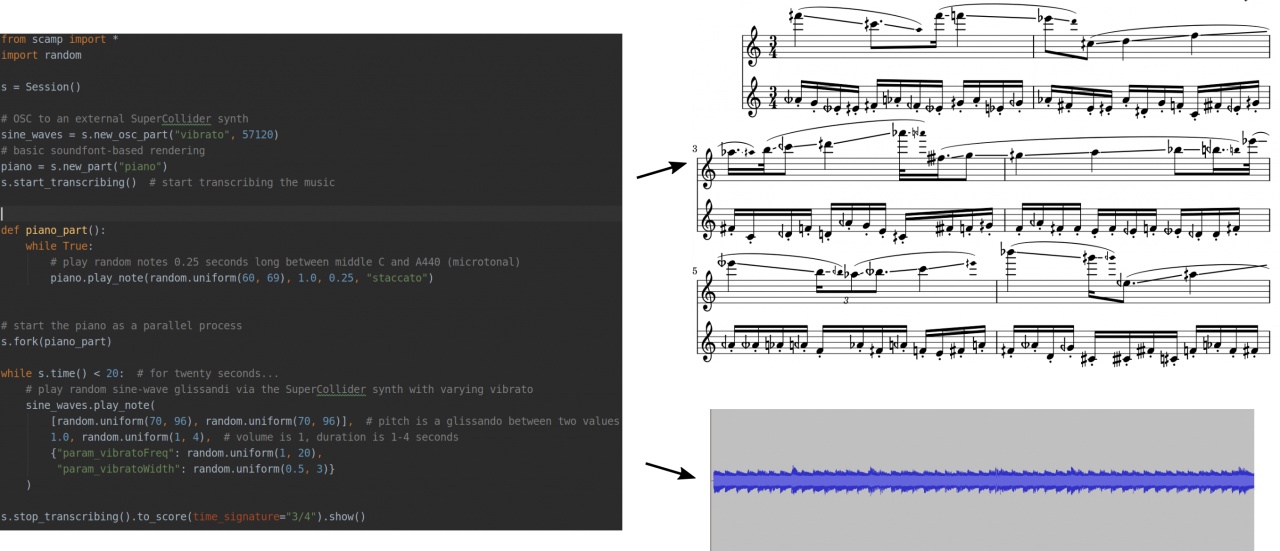 SCAMP is the result of many years of my own compositional practice in Python, and evolved out of my own personal composition libraries. Over time, I found that I had to solve the same set of technical problems over and over again: how to manage the flow of time, how to manage MIDI pitch bends for microtonal music, how to produce music notation, among many others. SCAMP aims to provide a simple interface that solves these problems and allows the composer/programmer to focus on musical concerns. The following video provides a good introduction to the framework: